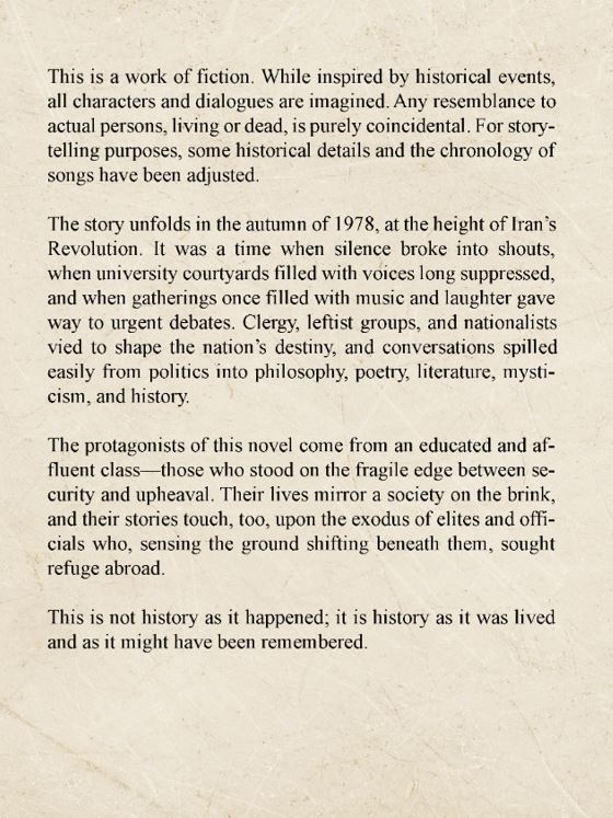 The story unfolds in the autumn of 1978, at the height of Iran’s Revolution. It was a time when silence broke into shouts, when university courtyards filled with voices long suppressed, and when gatherings once filled with music and laughter gave way to urgent debates. Clergy, leftist groups, and nationalists vied to shape the nation’s destiny, and conversations spilled easily from politics into philosophy, poetry, literature, mysticism, and history. h